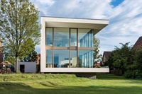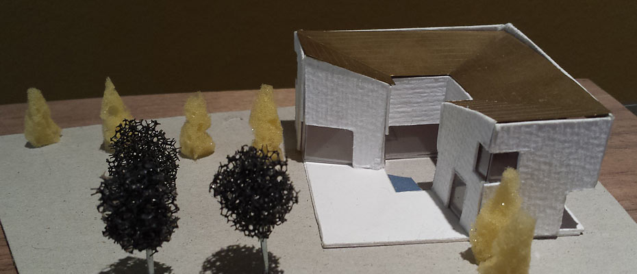 Beispiel: Einfamilienwohnhaus für generationsübergreifendes Wohnen in einem heterogenen, gewachsenen Baufeld aus den 1960er Jahren. Die leichte Hanglage lässt den langgestreckten Baukörper über die Längskante talwärts auskragen.
