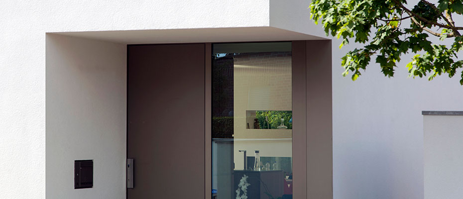 Materialien: Weiße Putzflächen für Wände und Decken, Bronze und Glas für Fenster, Kalkstein für den Boden.